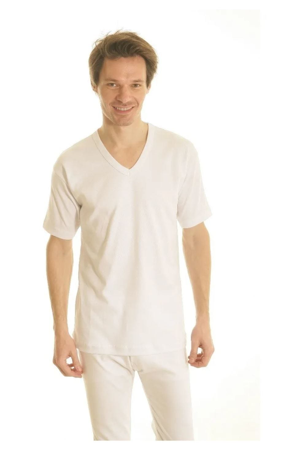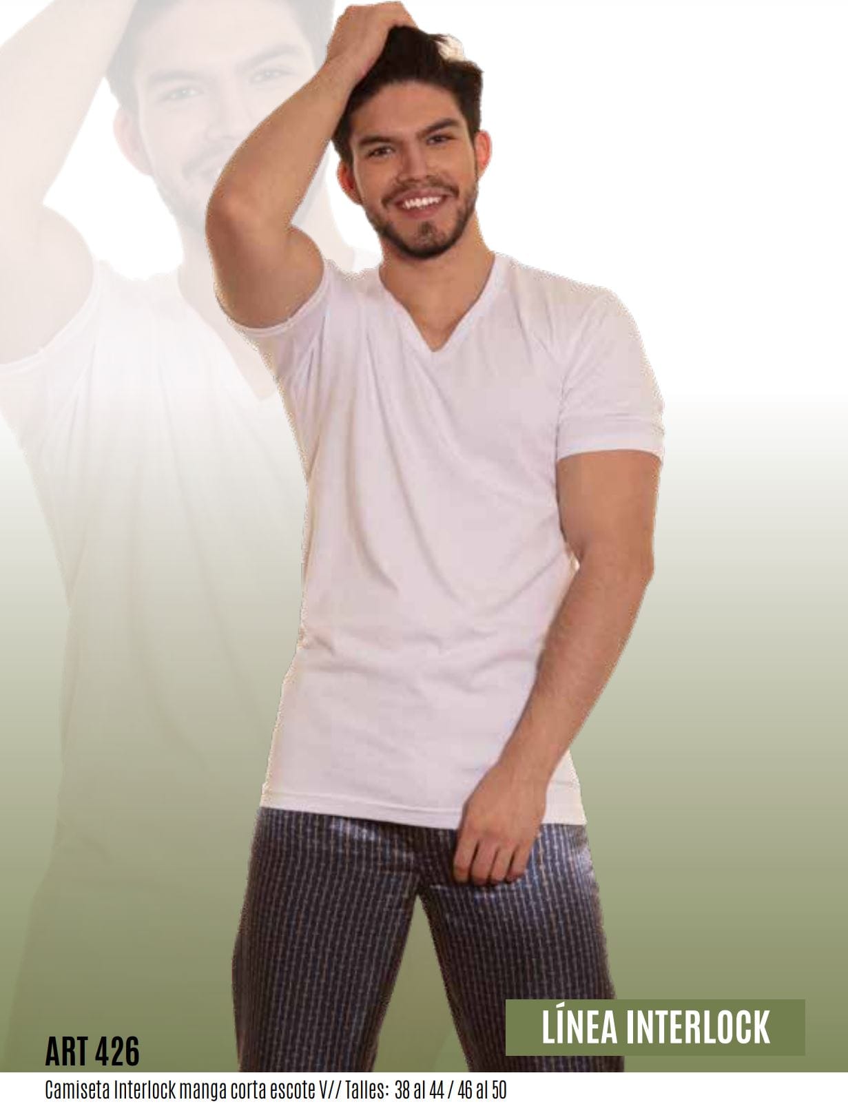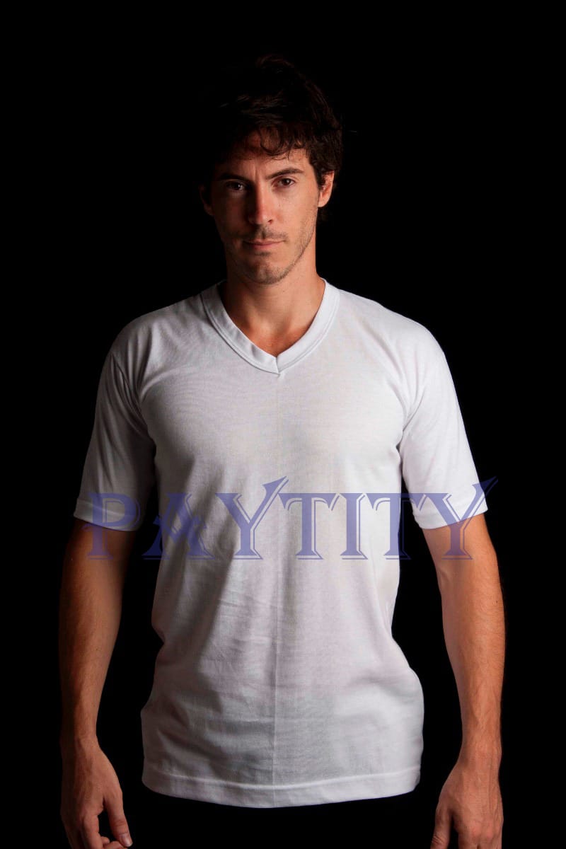 Camiseta interlock manga corta escote en V. Talles 38 al 44 y del 46 al 50.
