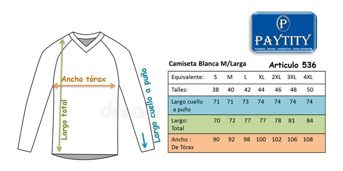 Camiseta térmica manga larga escote en V. Color blanco. Talles 38 al 44 y del 46 al 50. Precio variable según el talle.